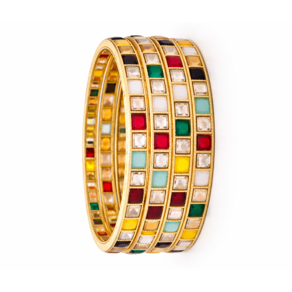 Elevate your traditional and festive look with this Premium Gold Finish Multicolor Stone Studded Bangles Set. Designed with vibrant square-cut stones in red, green, yellow, white, black, and pastel tones, these bangles bring a luxurious and colorful charm to any outfit.