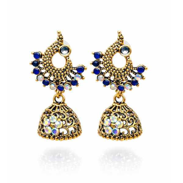Enhance your ethnic elegance with these exquisite antique gold blue stone jhumka earrings. Designed with a crescent-shaped stud embellished with royal blue stones and shimmering crystal accents, these earrings are finished with an intricately carved dome jhumka featuring multi-faceted stones for a luxurious sparkle.
