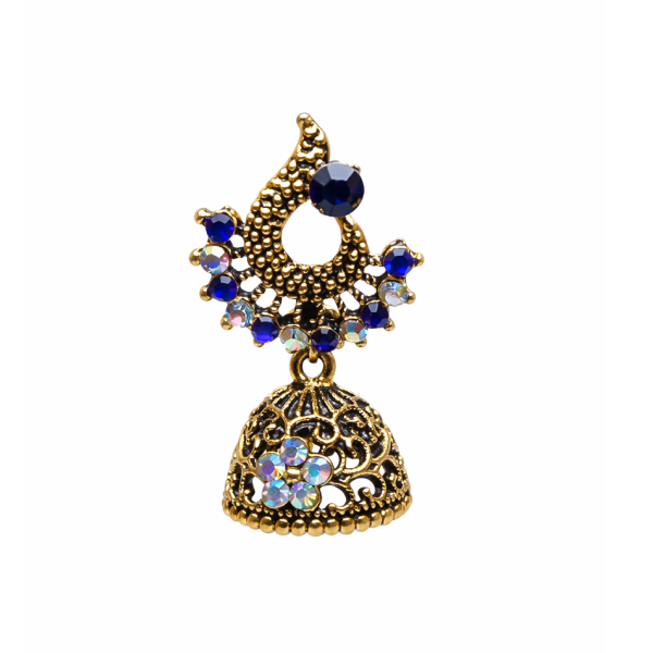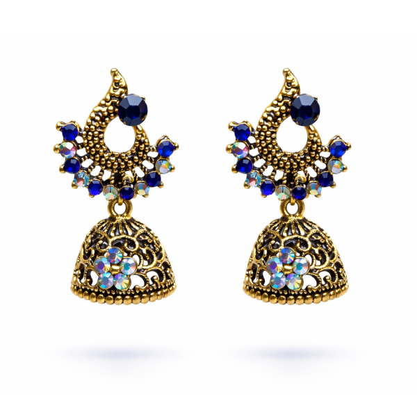 Make a bold ethnic statement with these antique gold navy blue stone jhumka earrings. Featuring a crescent-shaped stud adorned with deep navy blue stones and sparkling crystal highlights, these earrings are paired with an intricately carved dome jhumka enriched with multicolor crystal stones for a rich, festive finish.