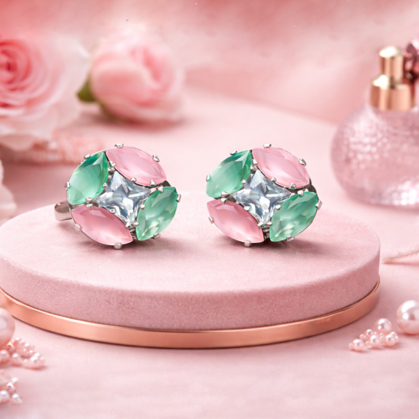 Add a soft pop of elegance to your look with these beautiful pastel green and pink CZ floral stud earrings. Designed with marquise-cut pastel stones surrounding a sparkling square-cut cubic zirconia center, these earrings offer a fresh, modern, and luxurious appearance.