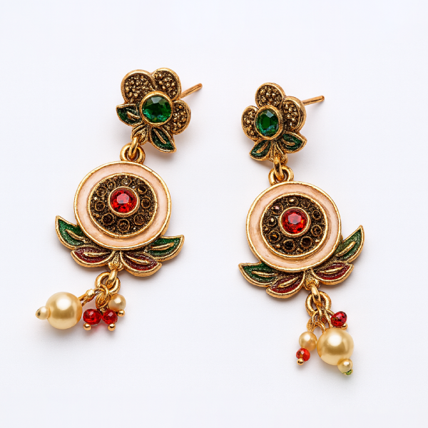 The matching earrings perfectly complement the choker, showcasing the same antique finish, floral elements, and multi-colored beads for a complete, coordinated festive look.