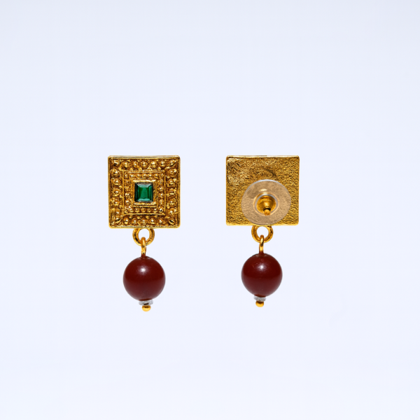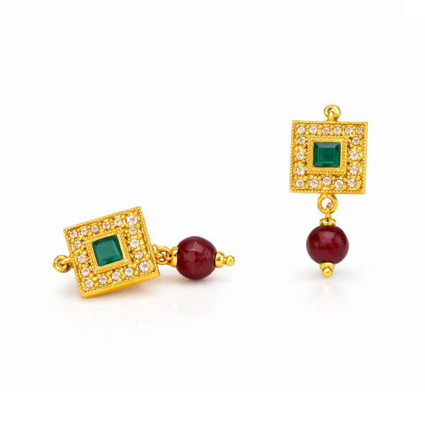 Add timeless charm to your ethnic look with this elegant traditional gold finish Kundan style necklace set. Designed with square green stones, intricate gold detailing, and hanging bead accents in red and green tones, this necklace reflects classic Indian craftsmanship.
