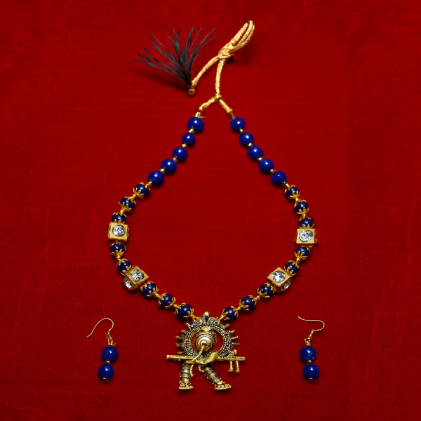 The highlight of the necklace is the intricately detailed peacock-inspired pendant, symbolizing grace and beauty, finished in antique gold tones. Matching blue bead drop earrings complete the set, making it a perfect coordinated ensemble for festive and traditional occasions.