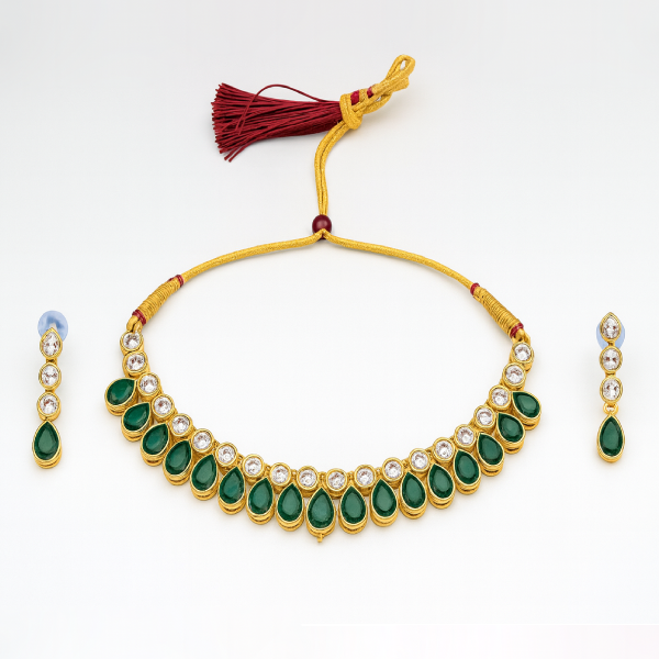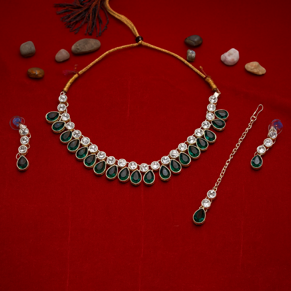 The choker features alternating green drop stones and shimmering white crystals, set in a sleek gold-toned frame that exudes richness and class. The earrings and tikka follow the same elegant design, giving you a flawless and cohesive look.