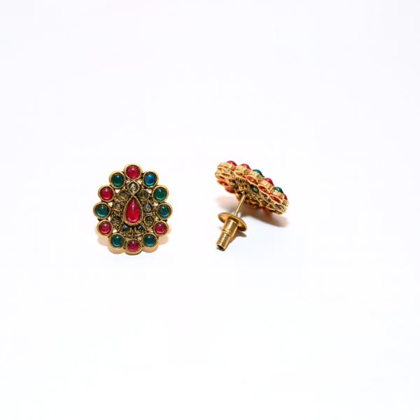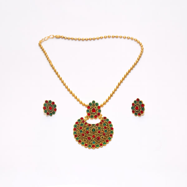 Add royal elegance to your festive look with this beautiful traditional gold finish necklace set. Designed with rich red and green stones arranged in a floral-inspired pendant pattern, this necklace features a classic gold-toned chain and comes with perfectly matching stud earrings.