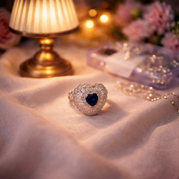 This stunning statement ring is a beautiful expression of elegance and charm. Designed with a captivating heart-shaped centerpiece in a deep blue hue, it is surrounded by a dazzling halo of finely set cubic zirconia stones that amplify its brilliance. The layered halo design enhances the depth and sparkle, creating a luxurious and eye-catching effect. Crafted from premium alloy with a polished silver-tone finish, this ring offers a high-end look while remaining lightweight and comfortable. The intricate setting ensures maximum shine from every angle, making it a true standout piece.
