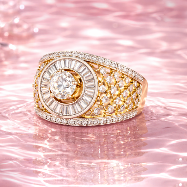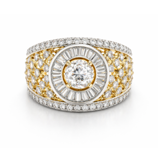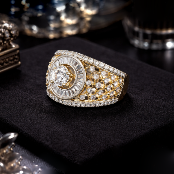 Make a bold style statement with this exquisite gold and silver finish CZ halo designer ring. Featuring a sparkling round-cut cubic zirconia center stone surrounded by baguette-style halo detailing and intricate lattice work on the band, this ring delivers a luxurious fine-jewellery-inspired look.