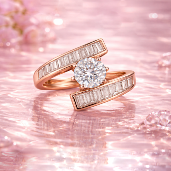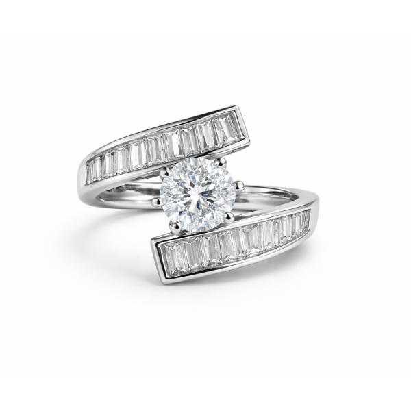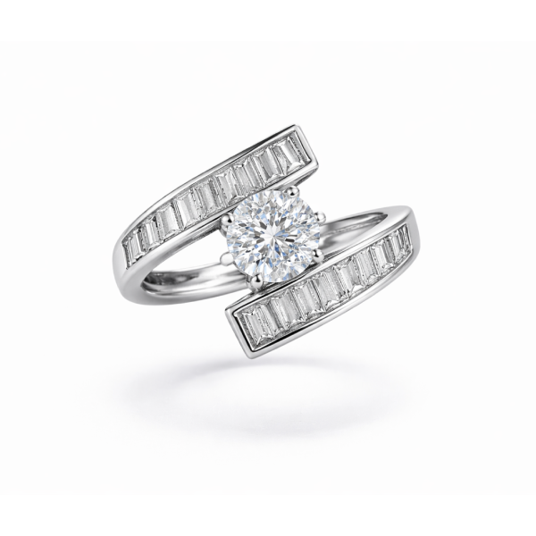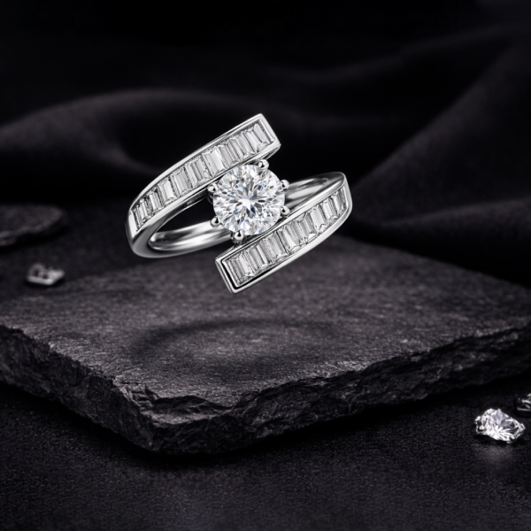 Add instant glamour to your look with this silver finish CZ cocktail ring. Featuring a brilliant round-cut center stone framed by sleek baguette-cut crystal accents on a modern open-band design, this ring delivers luxury-inspired elegance at an affordable price.