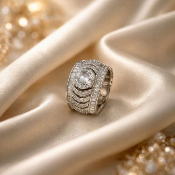 This beautifully crafted statement ring blends delicate artistry with modern brilliance. Designed with an intricate filigree pattern, it features layered bands adorned with finely set cubic zirconia stones that create a soft, shimmering texture. A stunning round-cut centerpiece rises elegantly above the design, adding a refined focal point and enhancing its luxurious appeal. The detailed openwork combined with a polished silver-tone finish gives this ring a romantic and sophisticated charm. Crafted from premium alloy, it offers a high-end look while remaining lightweight and comfortable for everyday elegance.