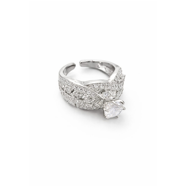 This exquisite statement ring showcases a beautifully layered wrap design that blends elegance with intricate craftsmanship. Featuring multiple overlapping bands, it is adorned with finely detailed textures and shimmering cubic zirconia stones that create a rich, dimensional look. A striking pear-cut centerpiece adds a graceful focal point, enhancing the ring’s luxurious appeal. The detailed engravings combined with a high-polish silver-tone finish give it a sophisticated and premium aesthetic. Crafted from high-quality alloy, this ring delivers maximum brilliance while remaining lightweight and comfortable for extended wear.