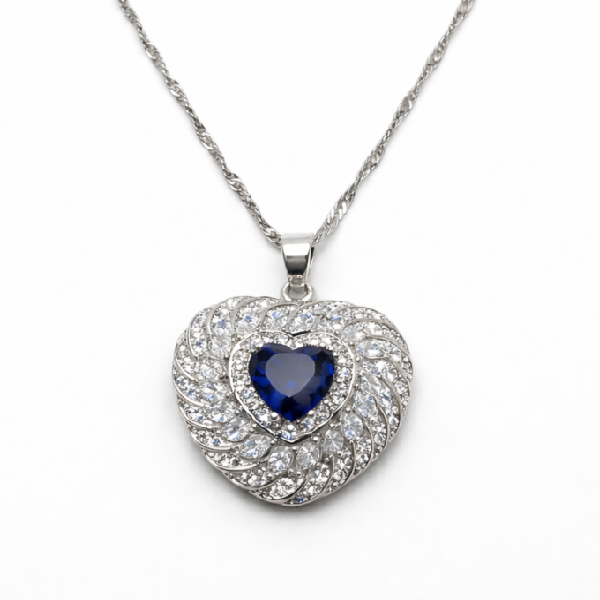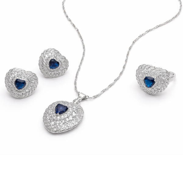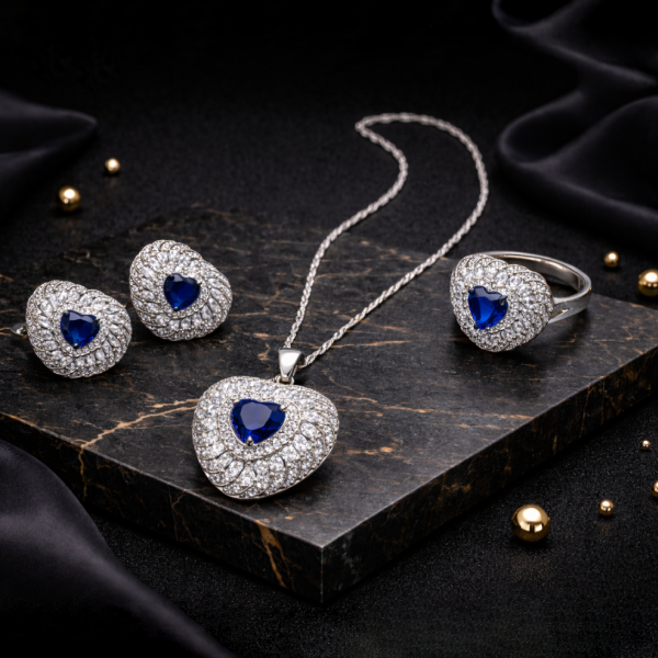 Add a touch of luxury and romance to your look with this stunning blue heart crystal jewellery set. Designed with a deep blue heart-shaped stone at the center, surrounded by sparkling clear crystals in a swirl pattern, this set delivers a premium and elegant finish.