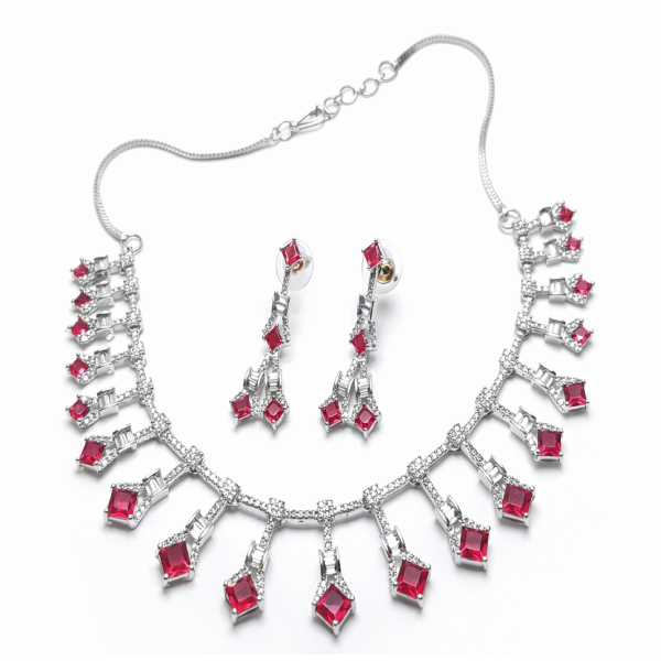 Make a bold and elegant statement with this stunning ruby red cubic zirconia necklace set. Designed with square-cut ruby red stones framed with sparkling CZ crystals, this necklace is paired with perfectly matching drop earrings for a complete, glamorous look.