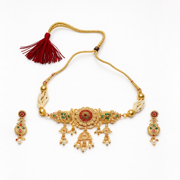 The adjustable dori-style closure with elegant tassels adds both comfort and a classic ethnic touch. Paired with matching earrings featuring coordinated kundan work and pearl accents, this jewellery set is a perfect choice for brides, festive celebrations, weddings, and traditional occasions.