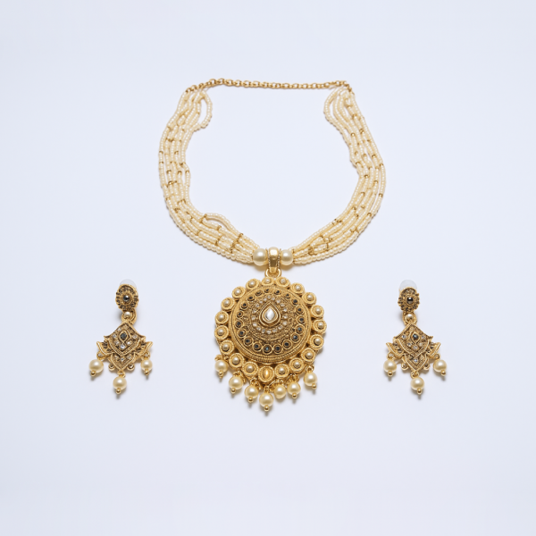 Add royal elegance to your traditional ensemble with this beautifully crafted gold tone kundan pearl necklace set. Designed with multiple strands of delicate pearl beads, the necklace features an intricately detailed circular kundan pendant adorned with pearl drops for a regal finish.