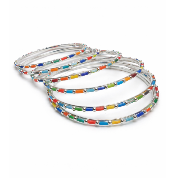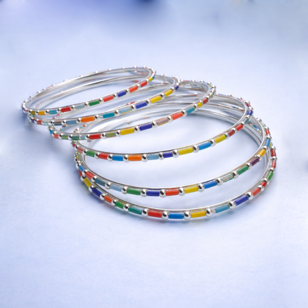 Add a vibrant touch to your jewellery collection with this Trendy Silver Finish Multicolor Beaded Bangles Set. Designed with colorful enamel beads in red, blue, green, yellow, and orange tones, these bangles bring a fresh, playful, and stylish charm to any outfit.